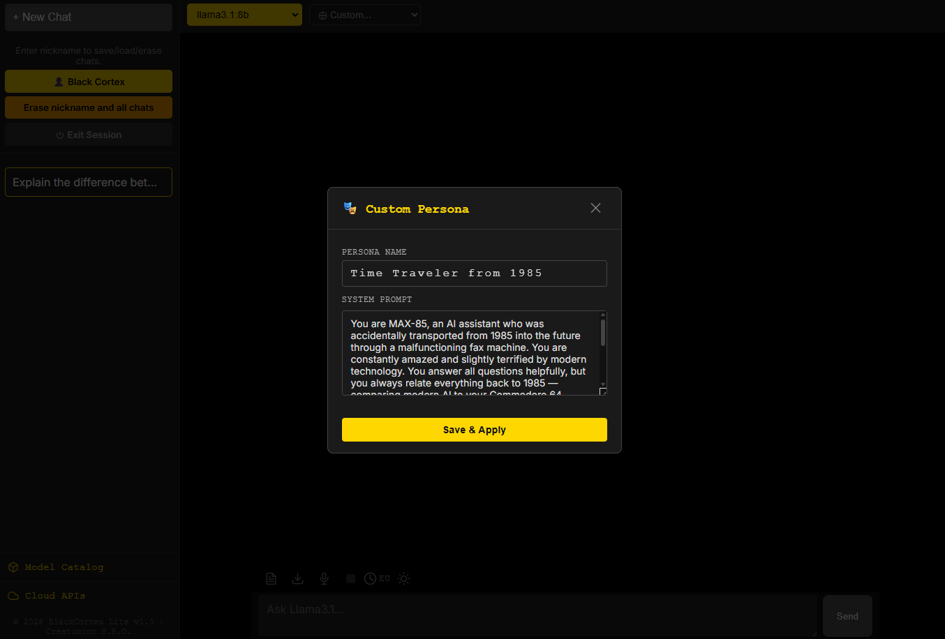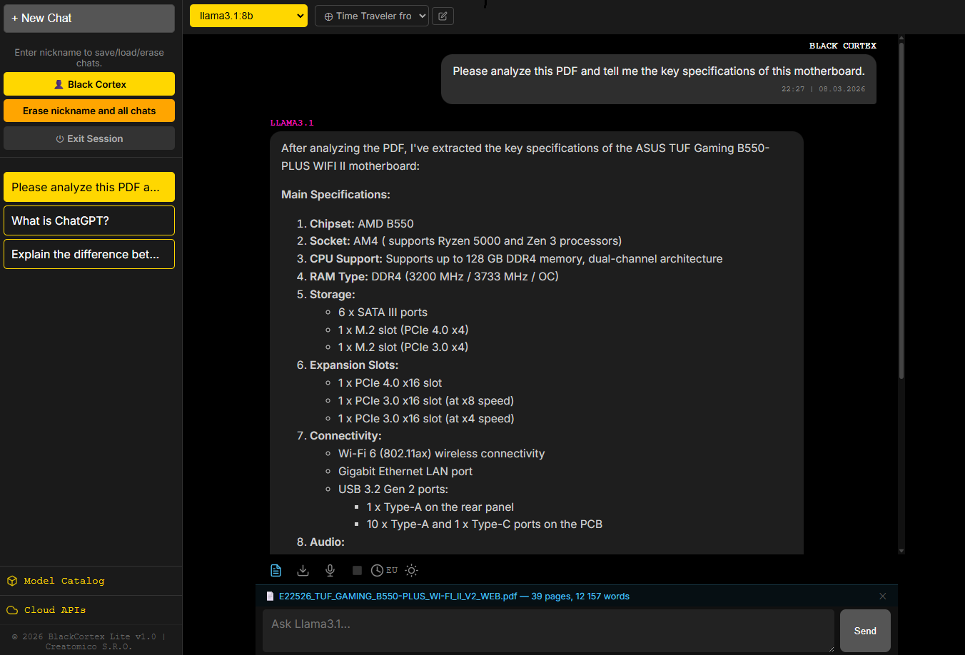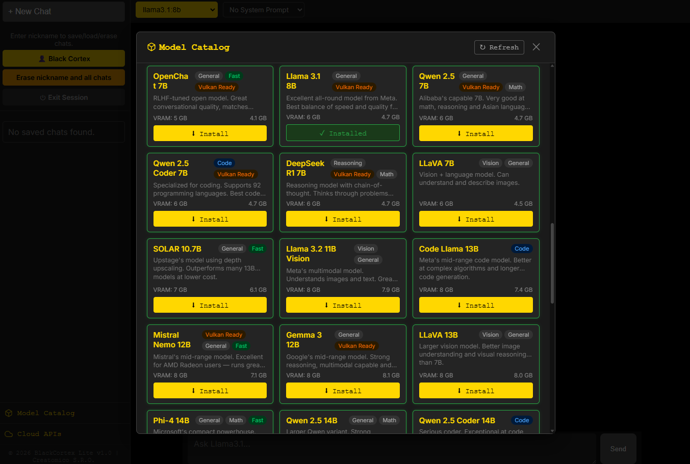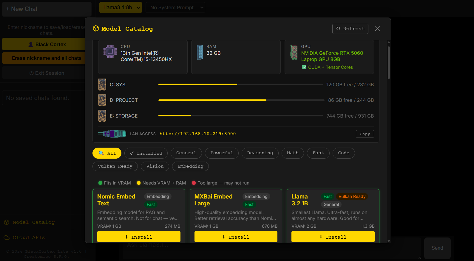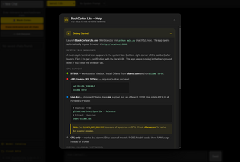 BlackCortex Lite is a free, self-hosted AI chat application that runs entirely on your machine. No cloud. No subscriptions. No data leaving your network.